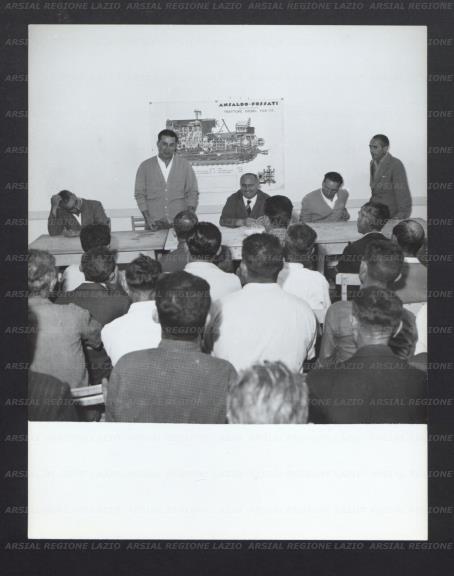 titolo attribuito: Azienda di Malagrotta. Assegnatari riuniti per la firma dei contratti. Un rappresentante dell'ente Maremma prende la parola